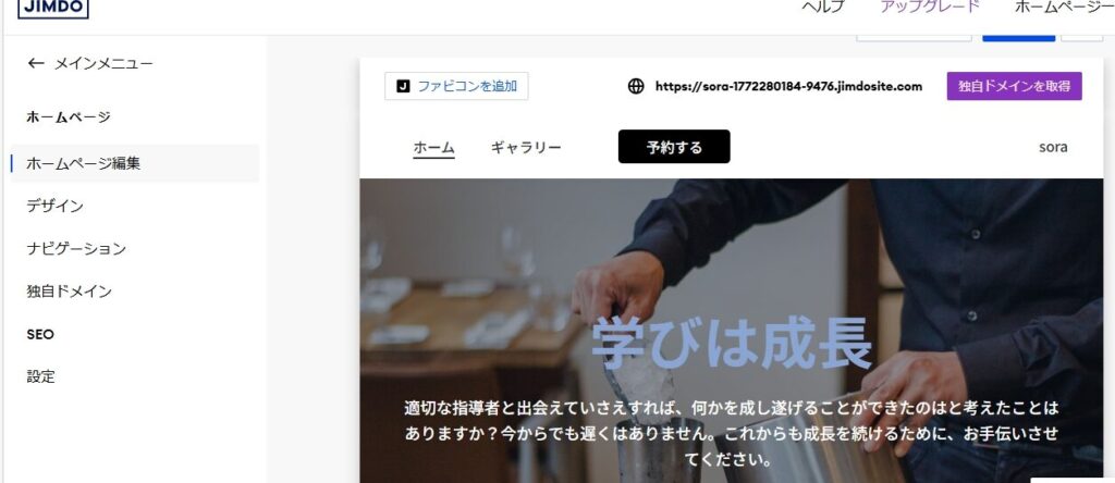 僕も実際にJimdoでホームページを作ってみました。AIの質問に答えるだけで綺麗なデザインに仕上がったので、これは便利だなと思いました。編集画面もシンプルなので、クリックができれば操作は簡単です。